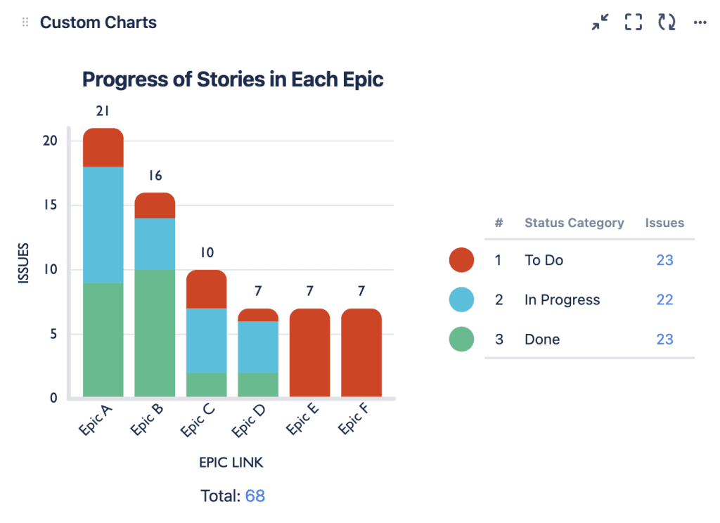 As you can see, we’re making headway on epics A, B, C, and D, but not so much on epics E and F. In fact, all of the issues in epics E and F are in “to do”. None are “in progress”. It could be a matter of timing or prioritization, or it could mean that the assignees working on these issues need some help.