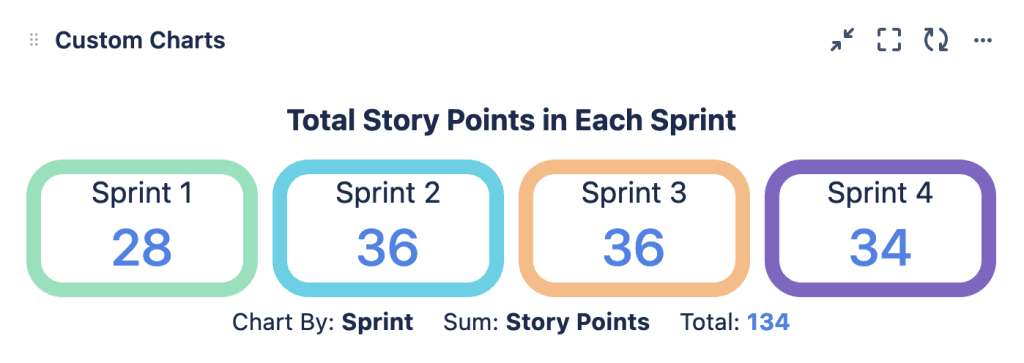 The tile chart above is a great way of spotlighting some important numerical data points. Here we’re looking at sprint velocity. So we’re charting by sprint and calculating the sum of story points to see how many story points were completed in the last four sprints.