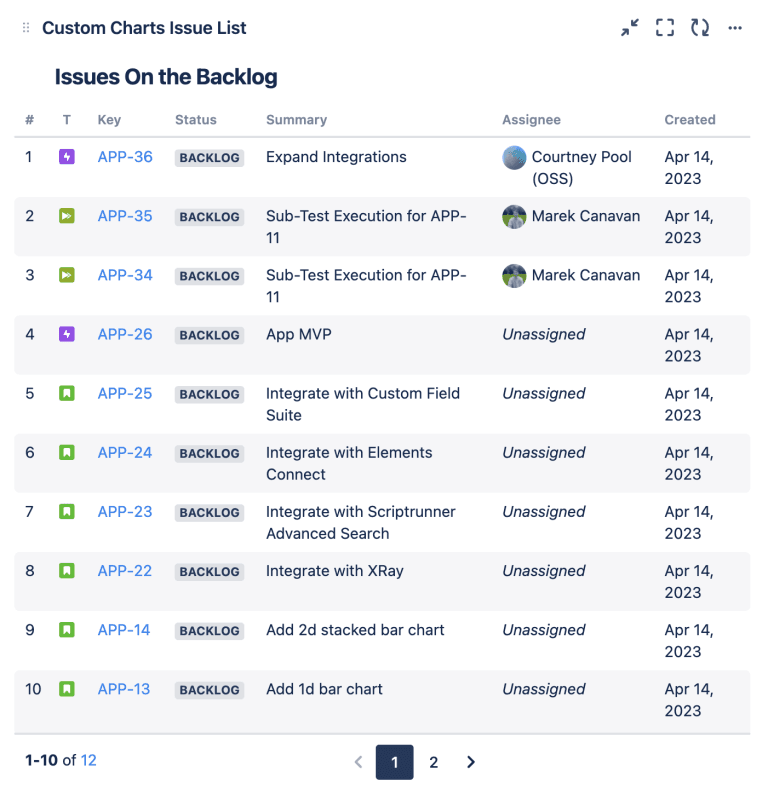 All the visualizations mentioned in this article can be generated from a single gadget: the Custom Charts gadget. But Custom Charts also comes with a separate gadget, the Issue List, which allows you to add a list of issues matching a search filter to your dashboard.