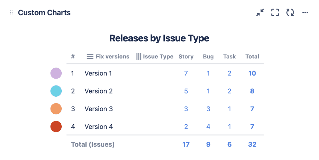 Releases by Jira issue type 2D table chart