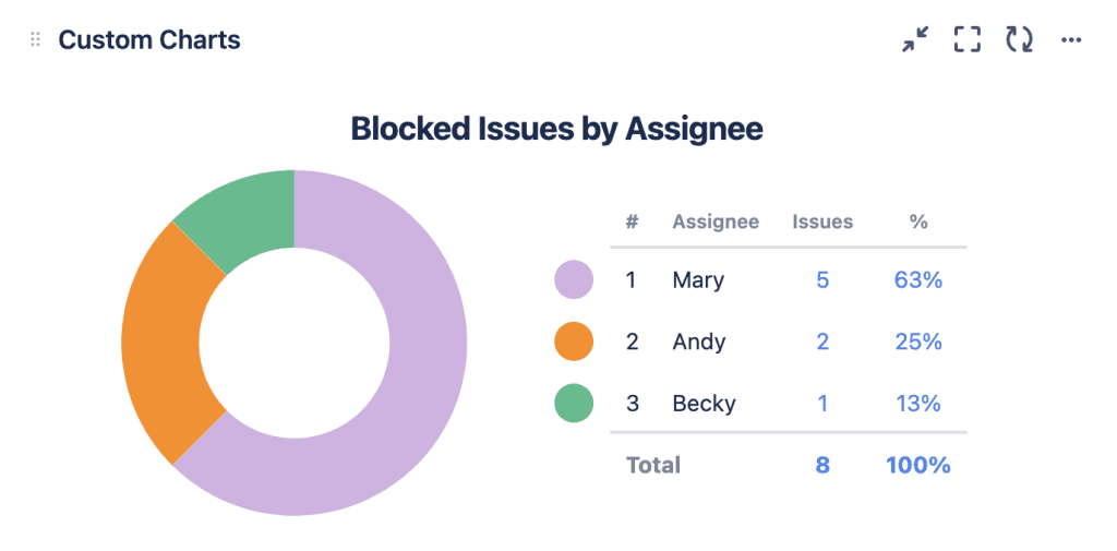 The pie chart above has 3 different-sized slices, each one bigger than the other. Here we’re looking at blocked issues by assignee and can see that Mary has the most blocked issues, Andy the second most, Becky the least. A Scrum Master can look at this as an indication that Mary may need some extra help.
