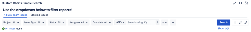 Like the Issue List, Simple Search is a separate gadget that comes with Custom Charts. You can connect Simple Search to any of the charts on the dashboard and use it to filter the data down further, by changing the items in the Simple Search dropdowns. For example, you might want to only see issues with a specific assignee across all the charts.