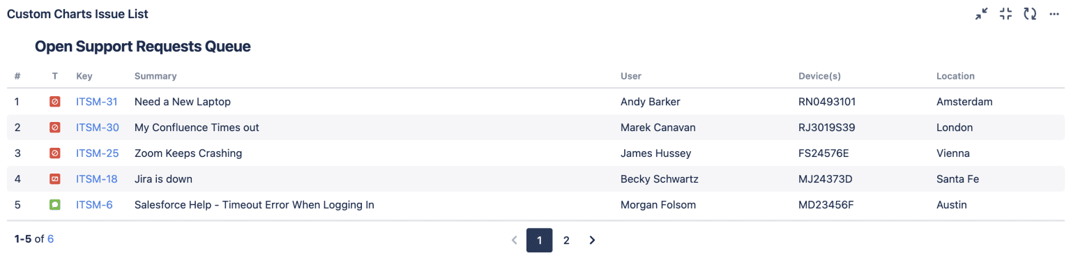 In our example below, Andy in Amsterdam needs a new laptop. Since we have the location of laptops in stock stored in Assets, we can take a look at the inventory to see if we have the necessary device to replace Andy’s laptop in the office already. Not only do we have the location as an Issue List column, but we also have the user who owns any currently assigned asset, as well as the ID of their device. By including these details as columns, the list can serve as a queue for the agents, providing helpful insight into the open support requests.