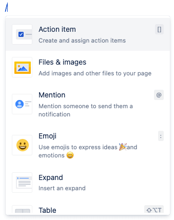 Become a Confluence wizard by mastering the power of the slash command. Tap the “/” key from any page to open a menu loaded with options. You can do everything from accessing tools and adding emojis to embedding Trello boards and macros with a single keystroke.
