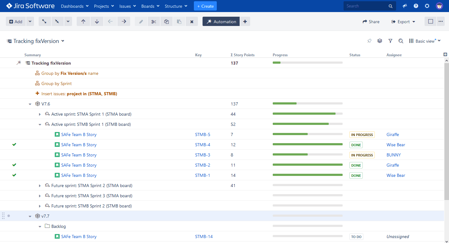 Like our other Automation features, you can include the Version Name Grouper with other generators, including other Group generators, to build highly-customized structures, providing exactly the information your teams need. Below are some examples where we can see how the new Version Name Grouper can help large organizations scale their agile processes.