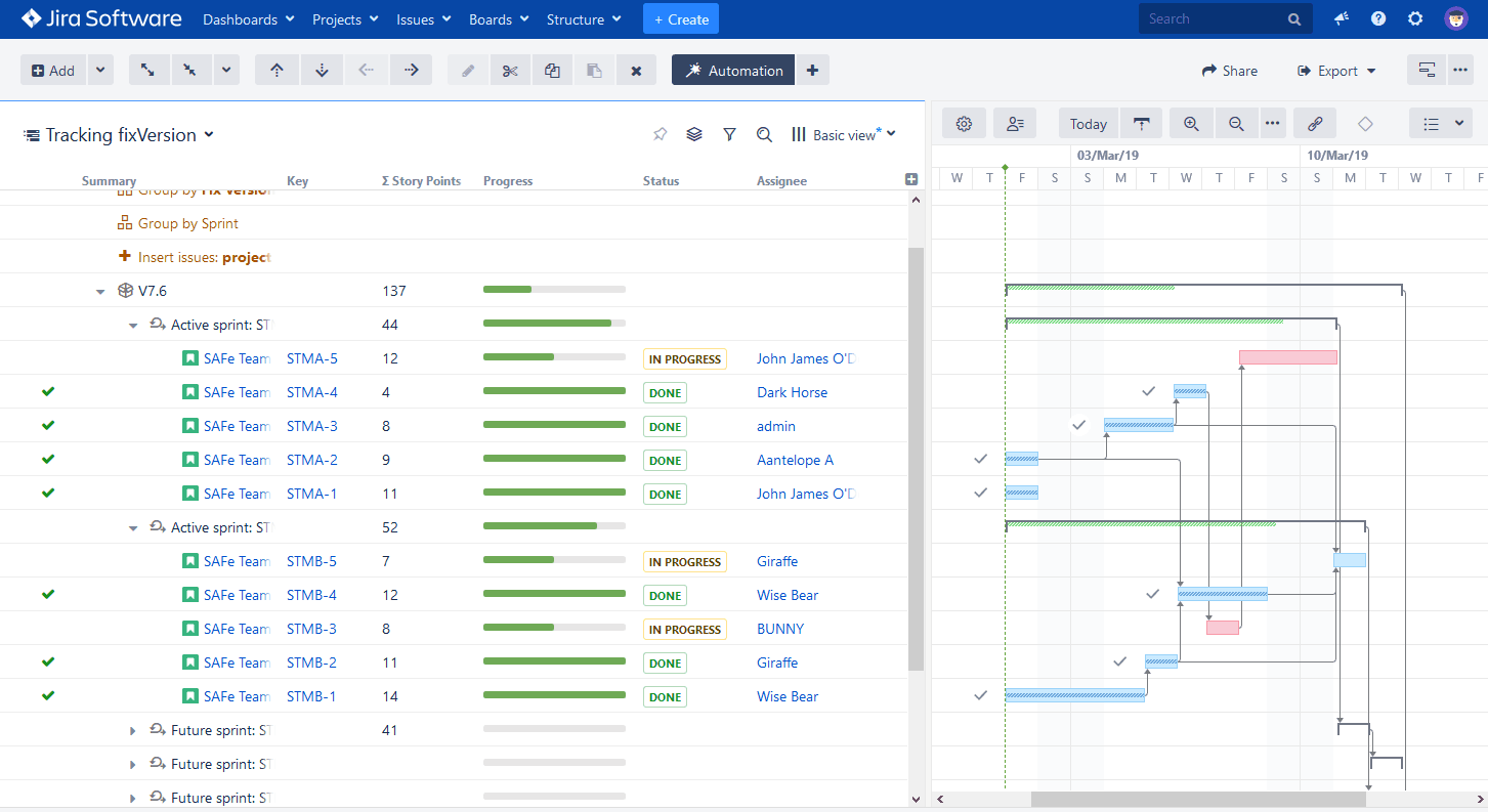 The Version Name Grouper effectively allows managers to track multiple teams working towards a common goal when that goal is defined in a specific version field. Synchronizing the visualization across fixVersions, PIs or other Version fields allows for easy cross-team planning and communication. This consolidated information also gives the manager the ability to act across multiple teams without needing multiple windows, since they still have access to Structure’s in-place editing functionality.
