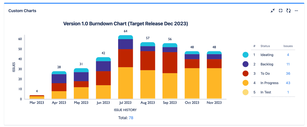 You could also make a burndown tracking the progress of multiple teams on a release. The chart below shows a major version being released at the end of the year. You can see that we started the year not knowing what would be part of it, therefore the scope kept increasing until the middle of the year. As of July, more work is in progress and we’ve started burning it down.