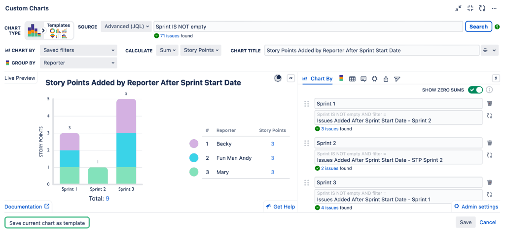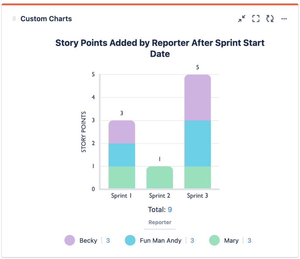 In the Chart By we’ve selected “Sprint” and in the Group By we’ve selected “Reporter”. That way, we can see who’s adding the extra issues. You could also Group By “Projects” to see which projects the issues are being added from.