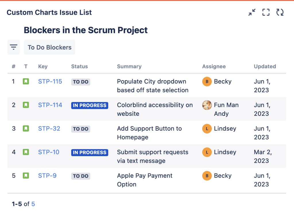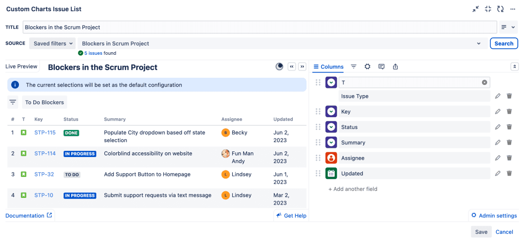 You can then use the Custom Charts Issue List, a separate gadget that comes with Custom Charts for Jira, to produce a list of details for the issues blocking work. Simply choose “Saved Filters” as the Source for your Issue List, and select the blockers filter you just made. If you want to, you can add quick filters such as “To Do Blockers” to show blockers that have not made any progress at all. It would be good to keep an eye on said issues because more and more work could start building up behind them if they’re not worked on soon.