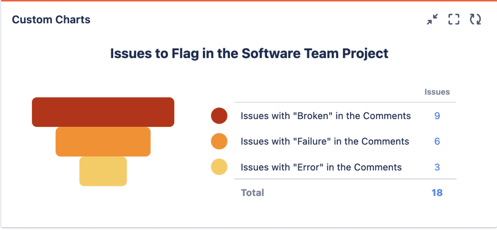 ScriptRunner comes with a very useful JQL function that lets you search for specific text in issue comments. For example, you might want to search for the words “error”, “broken” and “failure” to find issues that could have more serious implications. That way, Scrum Masters can quickly identify issues as items to watch or flag. A report that highlights these issues is also great for managing the expectations of higher-level managers and executives.