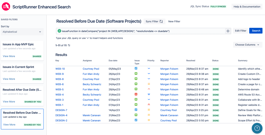 Using JQL natively means using the standard JQL functions that Atlassian provide. But if you’re not able to formulate your question using the default functions, you’ll need a Marketplace app. Our favorite option is ScriptRunner for Jira from Adaptavist. This comes with some fantastic JQL functions that you can add to your collection of saved filters and start making the dashboard reports you really need.