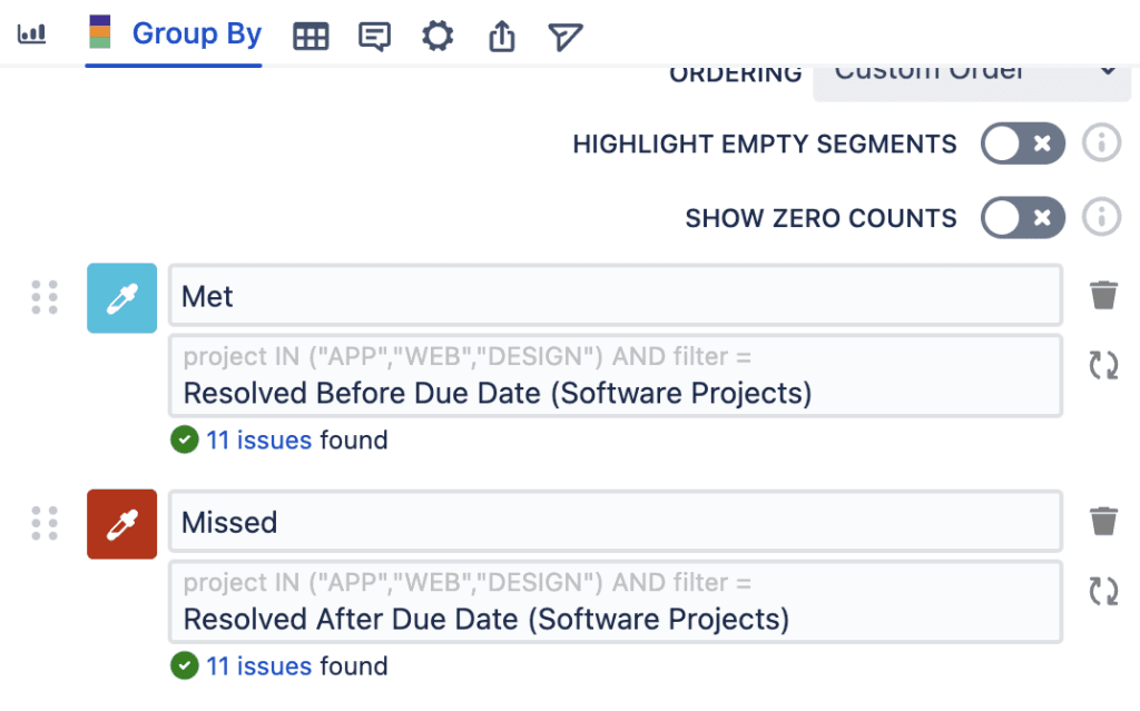 You can use the ScriptRunner JQL function “dateCompare” to track due dates met versus missed. Here you will need to create two ScriptRunner Enhanced Search filters to use in your chart. First, search for issues resolved before the due date in your chosen project and save as a filter.