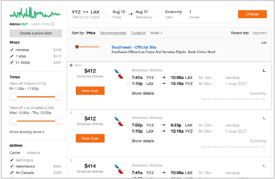 Below, you’ll see the flight search engine Kayak. It’s well-designed, simple, and intuitive. Unfortunately, it’s hard to tell where one should focus.