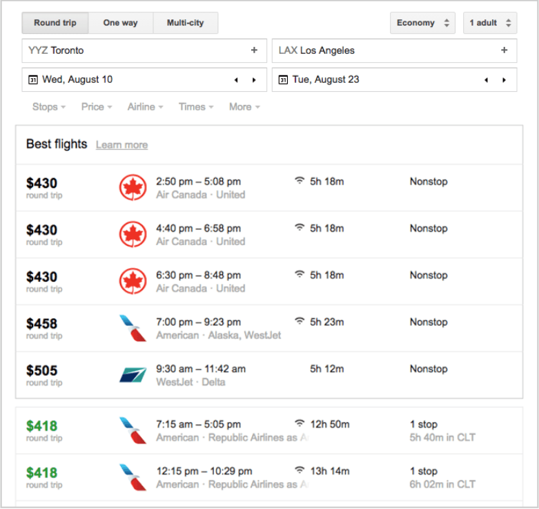 Is price a significant influence on you? Google lists lower prices first. Are certain airlines deal breakers? The page provides that information upfront. The product team considered what they already knew about users and prioritized accordingly.