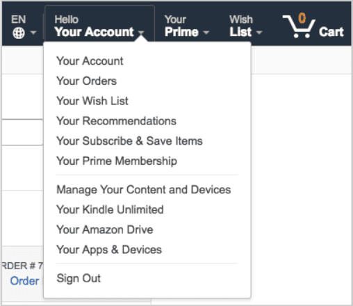 1. “Your Account” would be the natural first step to view past purchases. They start by hovering over it, which counts for half a click.