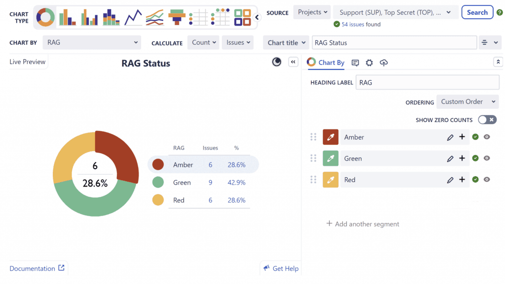 The best charts are the ones that mean something at a glance. Hence why those that use red, amber and green (RAG) coloring are so great. Everyone knows that red is bad and green is good. The following is a sample pie chart produced using our Custom Charts for Jira app. It gives an instant snapshot of completed, in progress, and unresolved work in Jira using RAG coloring, with percentages and issue counts down the side for added clarity.