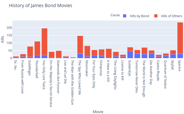 In this rather marvelous bar chart, there are only two colors and both are distinctly different. All the James Bond movies are named along the x axis, the color key’s explicit and obvious, and the white horizontal lines help us see where the bars sit in relation to the numbers. This clearly and attractively demonstrates that Spectre and You Only Live Twice were bloodbaths and Pierce Brosnan was not to be messed with.