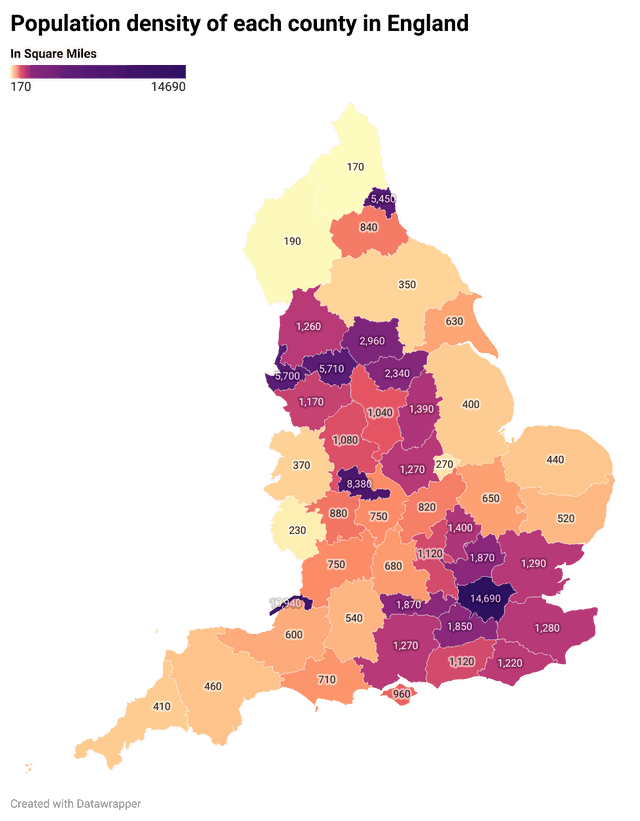 The fact that they’ve included the numbers in the county as well, so you don’t have to guess purely based on the color shade, makes it even easier to visualize the population density across the UK.