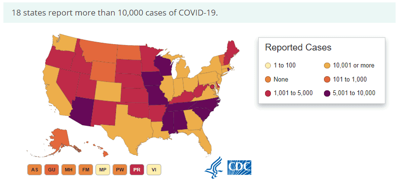 Not like this one. This one’s the anti-heat map. We’re wired to see the darkest or strongest color as having the highest amount of something, the lightest color as having the least. The following graphic goes against this assumption; the highest number of Covid-19 cases, “10,001 or more”, is represented by a lighter color than the lowest number, “None”. There’s literally no logic to the rest of the colors either. Fail.