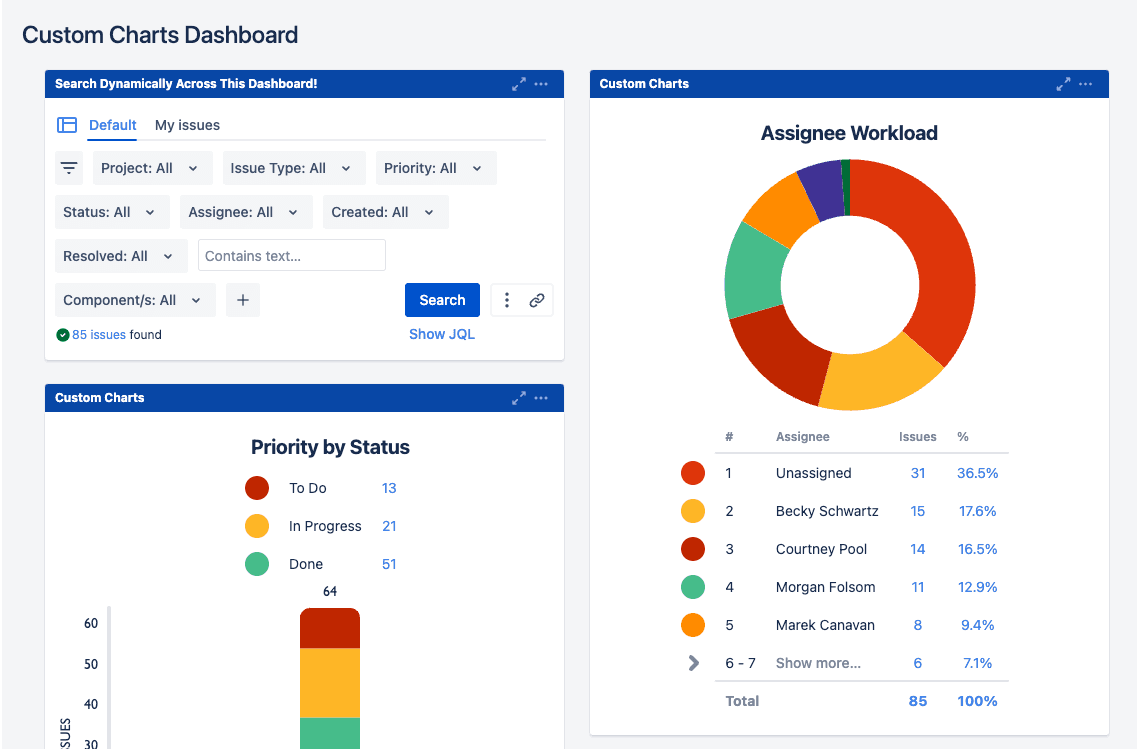 Custom Charts transforms Jira data into strategic insights. Instead of forcing you to export data and build charts elsewhere, Custom Charts lets you create comprehensive visualizations directly within Jira and Confluence – no technical expertise required.