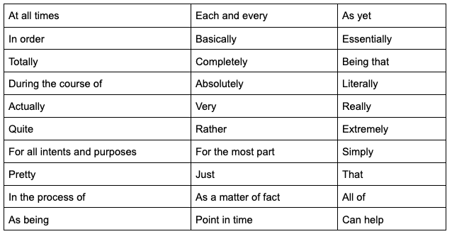 Another way to tighten your writing is to remove filler words from your vocabulary. The following words and phrases may dilute the power of your writing: