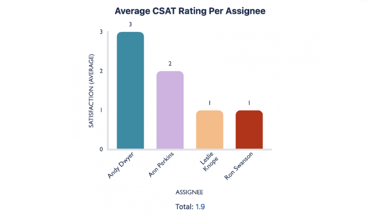 CSAT ratings can then be visualized using Custom Charts reports. Reports can be built out around specific customer organizations and on a per-assignee basis. Below, we’ve built a 1D Bar Chart to reflect the average CSAT rating per assignee in our support project. As we can see, the highest average is 3 out of 5 stars for Andy Dwyer, which means that no one on the team is getting consistently high ratings from customers. This information allows the department to reassess how they handle customer interactions to improve customer experience and team processes.