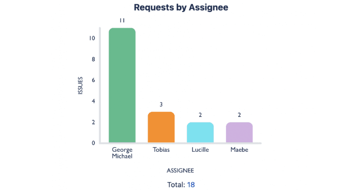 In the example above, we are using a 1D Bar Chart in Custom Charts to visualize Requests per Assignee in our ITSM project. We can see that George Michael is the assignee for 11 requests out of 18. That means he is responsible for over half of all requests from customers. Compared to the other team members, George Michael is taking on a lot more work. If that trend continues, George Michael will probably experience burnout and might even leave the business for another opportunity where he feels more supported.