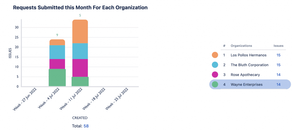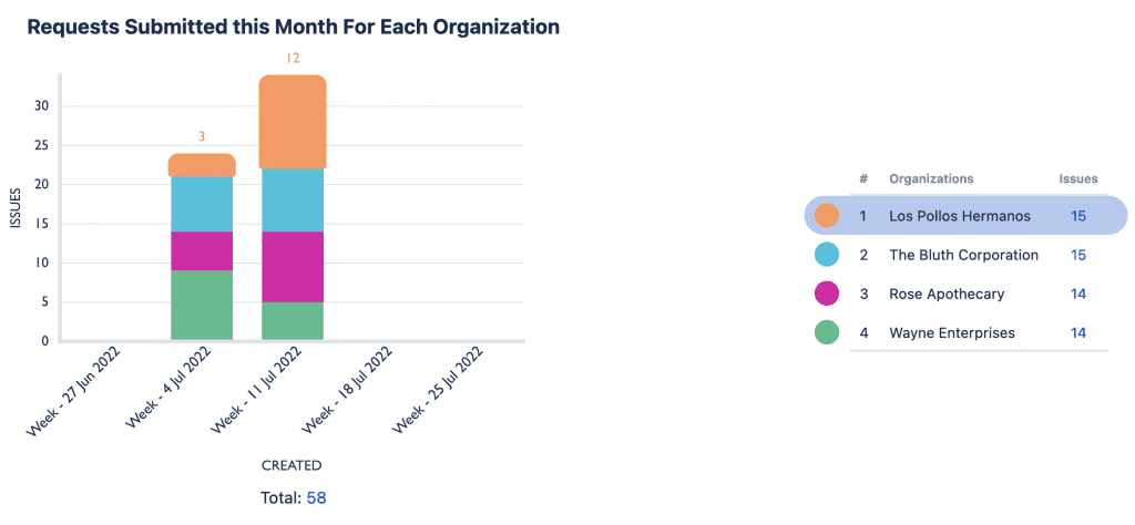 To create the 2D Stacked Bar Chart below, we’re pulling in issues from our Support project and have the Chart By set to Organizations, and the Group By set to Created. In screenshot 1, we can see that the customers at Los Pollos Hermanos only submitted 3 requests the week of July 4th, but quadrupled that the following week (12 submissions). In screenshot 2, we can see that Wayne Enterprises falls on the opposite end of the spectrum – they cut their submissions almost in half between the 2 weeks.