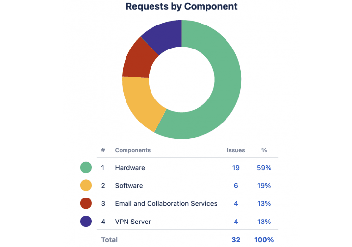 By building a Custom Charts Pie Chart that displays our support requests by Component, the team can get a good understanding of the nature of requests that are coming into the portal. As we can see below, most customers are submitting requests around Hardware (59%). Knowing this, the team can delve further into these requests and have some discussions.