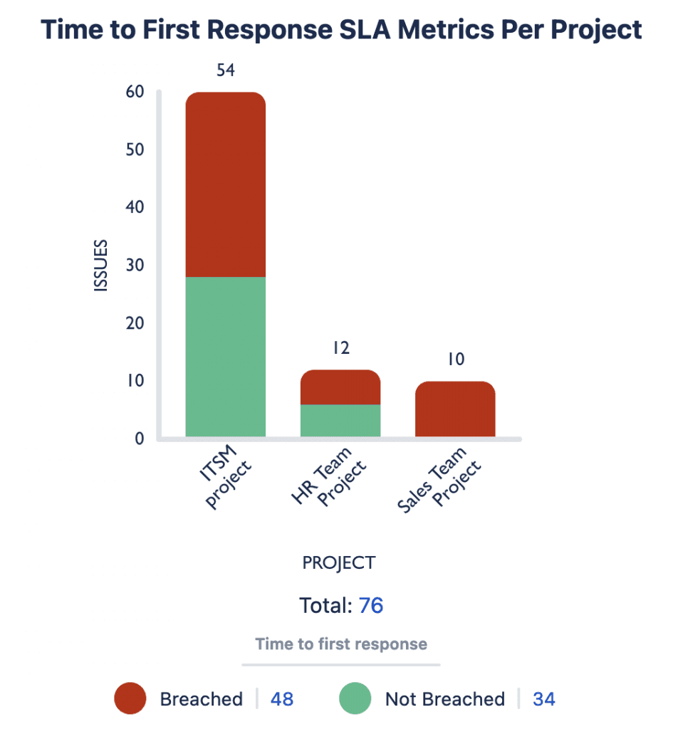Using this chart, we have direct insight into whether our various teams are meeting their SLA goals. We can see that in the ITSM Project, 32 out of 54 issues have breached the goal for the Time to First Response SLA. The team can then come together to have a conversation around either resetting the SLA goal or figuring out how they can work more efficiently toward meeting it. (Remember, since SLAs serve as a contract between the customer and the team, it’s important to keep customers in the loop on SLA goals.)