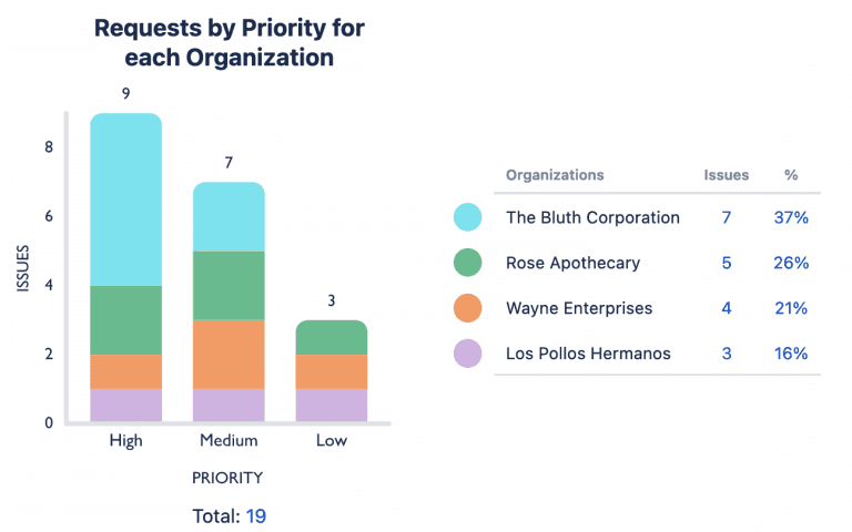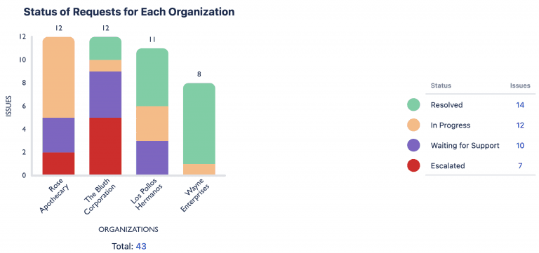 We can see that Rose Apothecary submitted 12 requests to the support portal, but none of them have been resolved. They also have a few requests that have been escalated. Most of the requests from the Bluth Corporation have been escalated and very few have been resolved. And meanwhile the team has resolved most of Wayne Enterprise’s requests.