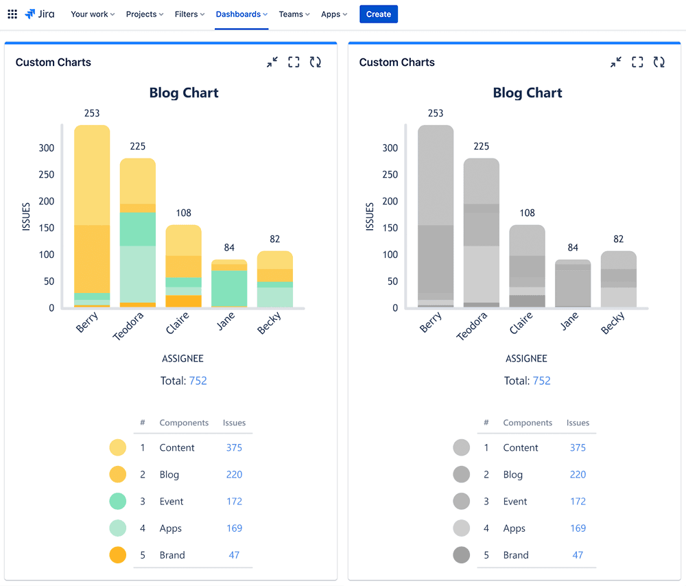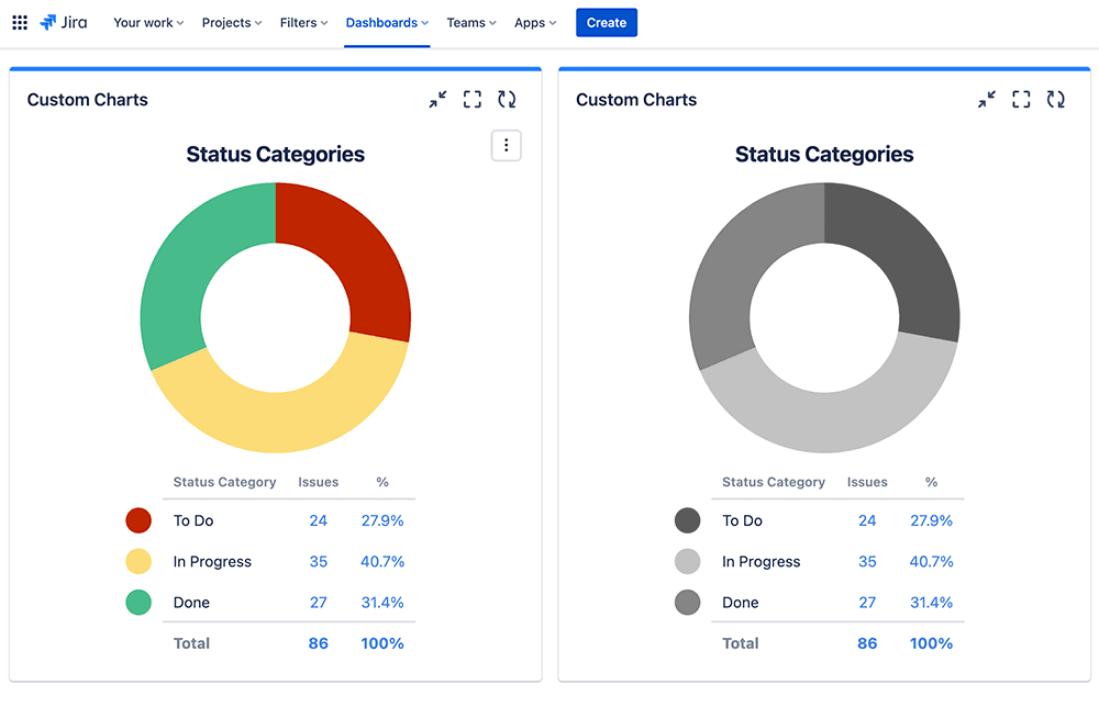 With out-of-the-box Jira, you don’t get any choice over the use of color, nor chart type, in your dashboard gadgets, which makes it impossible to customize them for color vision deficient readers. With Custom Charts for Jira and Confluence, you can select from a range of chart types, add or change labels, and choose an appropriate palette from a full color picker.