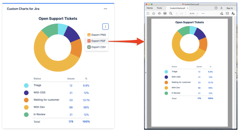 SLA compliance: When overseeing support services with Jira Service Management (JSM), you may need to provide managers and customers with statistics about SLAs that the standard reporting functionality doesn’t include. Exporting Jira to an Excel report, PDF file, or CSV format for analysis ensures compliance.