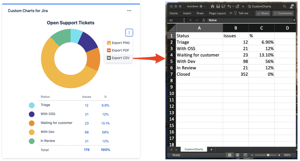 If you prefer working in Custom Charts for Jira Reports, you can export Jira charts and data directly from the reports page to a CSV file. Simply click the overflow menu icon at the top right of your report, then select “Export CSV.”