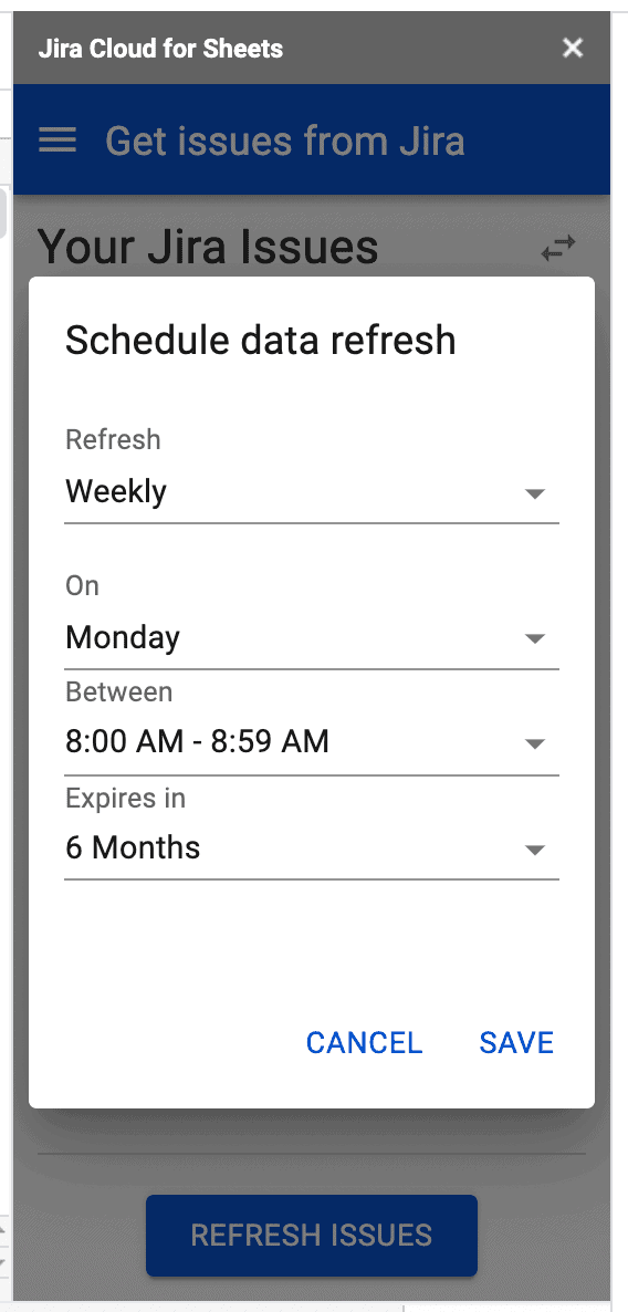 Next, you’ll see a window similar to the Excel version. Select “Get issues from Jira,” then scroll to “Schedule data refresh” to set the timetable for your updates.