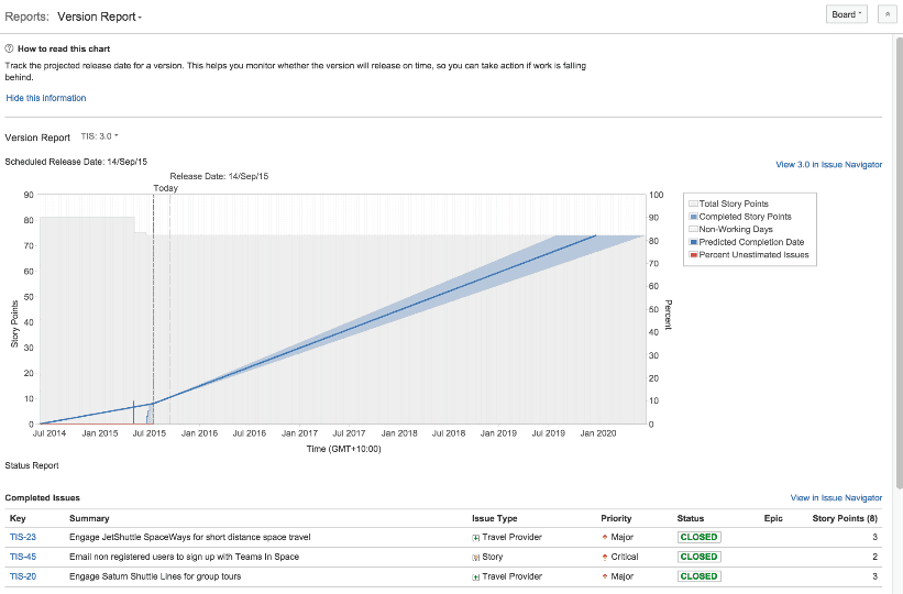 The Jira Version Report shows your team’s progress towards the completion of a version. It also gives you a predicted release date based on your team’s average rate of progress (their velocity) since starting the version, and the amount of estimated work that remains.