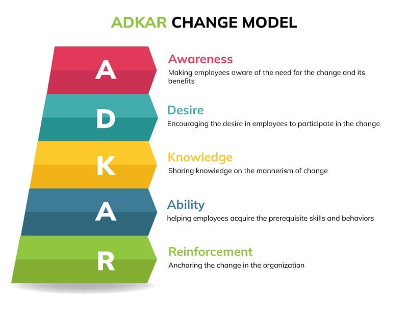 Jeff Hiatt and his team studied more than 900 organizations undergoing transitional change to develop the basis for the ADKAR model. The model emphasizes that leaders must accomplish five outcomes with each employee to ensure change takes hold.