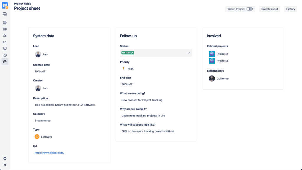 Natively, Jira lacks the capability to store project-specific information. Details such as the budget, start and completion dates, tech stack used, and even information on the project stakeholders are crucial for project managers who handle multiple projects at once. Having this data accessible and presented in a visual way allows not only the project manager, but the whole team, to give better insights and make calculated decisions easily.