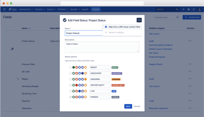 The dropdown next to “Chart By” has a list of values and will include the custom fields you’ve created using Projectrak. One of the custom fields is “Project Status”. When using Projectrak with Custom Charts, “Project Status” is a premade custom field that automatically maps into a Jira issue custom field, as seen below.