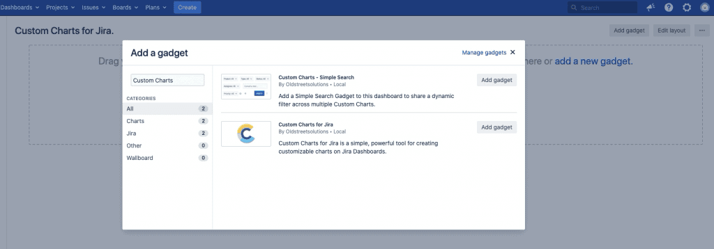 To integrate Projectrak and Custom Charts, you will have to first install the Custom Charts add-on from the Atlassian Marketplace. Once you’ve done that, navigate to your preferred dashboard (or create one) by clicking on the Dashboards menu. Once in your dashboard, click “Add gadget”, then search for the term “Custom Charts” and select it.