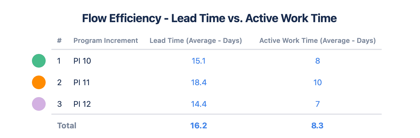In this Custom Charts table, we can see how the active work time (not including time spent waiting) compares to the overall lead or flow time (including time spent waiting) between PIs.