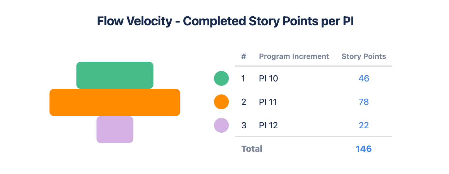 How fast is your ART delivering value? This Custom Charts funnel chart looks at the number of completed story points across PIs. It shows that the flow velocity of the ART increased a lot between PI 10 and 11, but dropped heavily in PI 12.