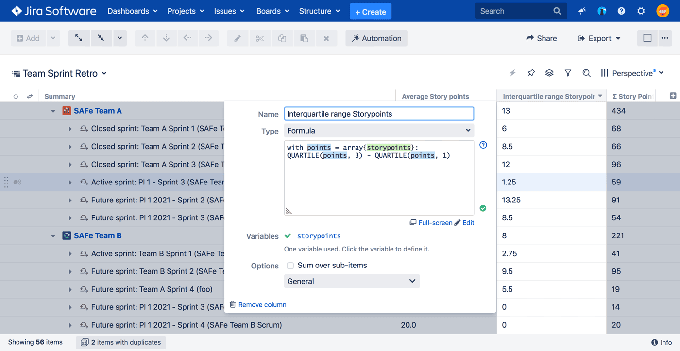 You can answer this question with Structure 7 — without having to export data to Excel (or any other tool) to do the calculation. You can calculate the mean story point estimate for all issues, as well as interquartile range, to see the estimated work variance as well as the same calculations on work logged for those issues.