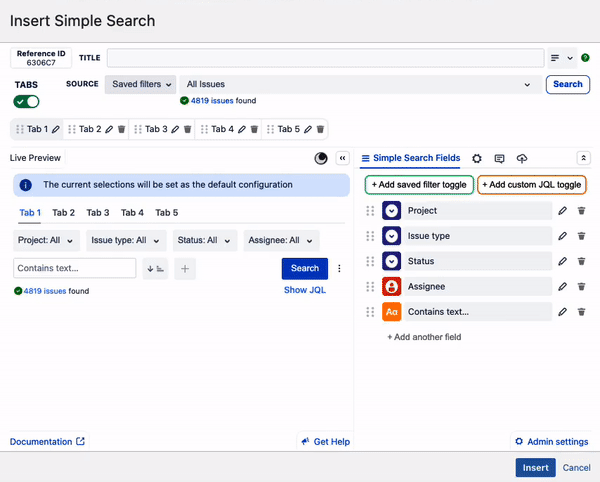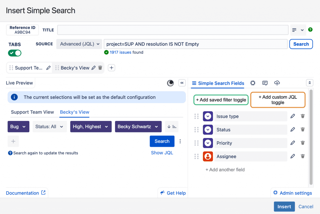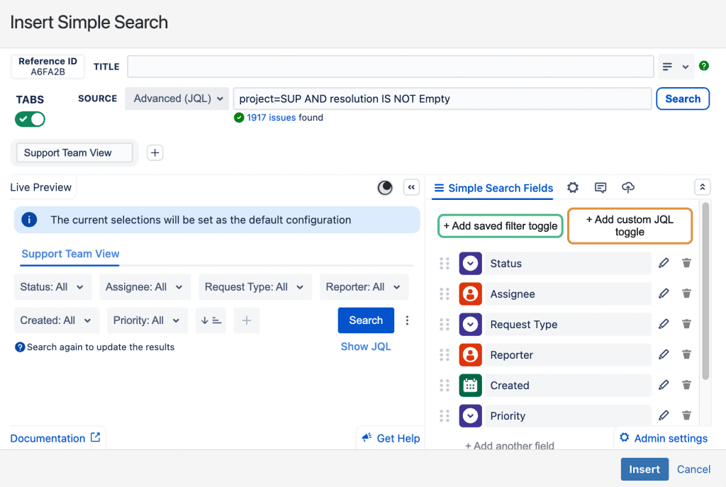Now you can click Insert to lock in all your Simple Search configurations and insert it onto your page or dashboard.