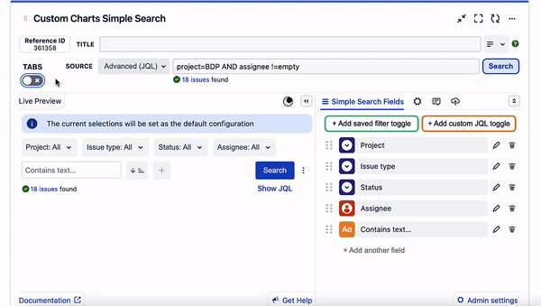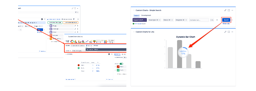 The Simple Search gadget/macro and the Custom Charts gadget/macro are separate and have unique configuration settings, although the user interface and customization options are very similar. Adding the interactive searching capability of Simple Search to Custom Charts happens by: