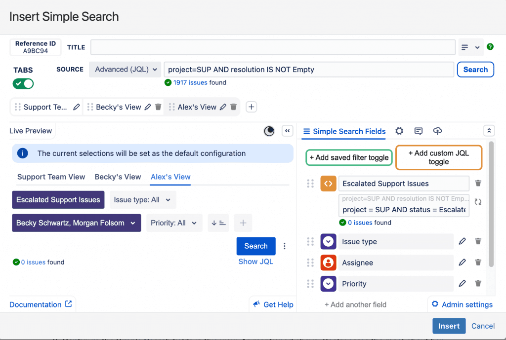 Add and configure the following Simple Search fields. Since Alex cares the most about issues escalated today for her team members, we want to make sure that we’re including those issues.