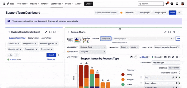 Voila! Now, when the support team, Becky, and Alex navigate to their Jira dashboard or Confluence page, they can utilize their specific tabs to see the data they’re most interested in transform into beautiful charts.