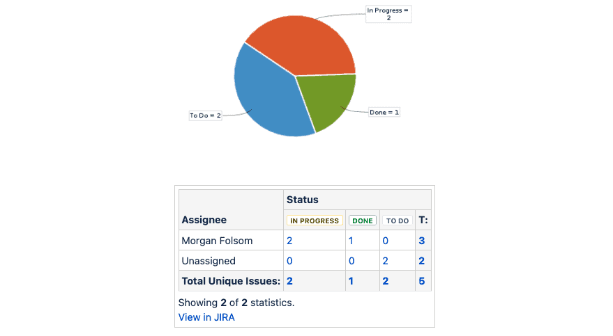 Using a single macro in Confluence, you can create a wide variety of charts, and select the specific Jira data that you’d like to report on. From this macro, you can create pie charts, bar charts, tables, and much more while also customizing colors, hiding/showing data as you need, and renaming to make the information more user-friendly.