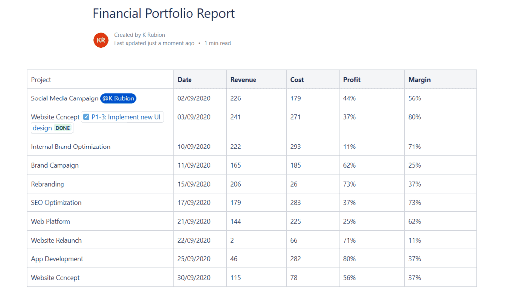In Confluence, you can create a financial report. Although you can generate one from a spreadsheet software, why build one in Confluence? If your project is integrated in Jira, you link a particular milestone or issue into your report. If there were issues that caused your team some major setbacks, then you can directly connect a Jira ticket into your report. You can even mention a member of your team in that report. This increases visibility in your process while keeping everyone in the group updated. Now you can easily monitor everything in one platform without having multiple tabs or apps open.