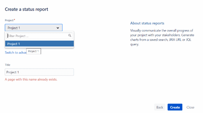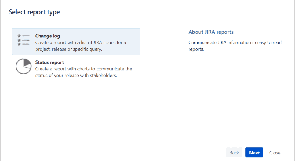 You can choose between a log type report or a status report with charts. If you select Status report, this generates a template with the generated graphics needed for your report. Make sure you choose the right Jira project for your report.